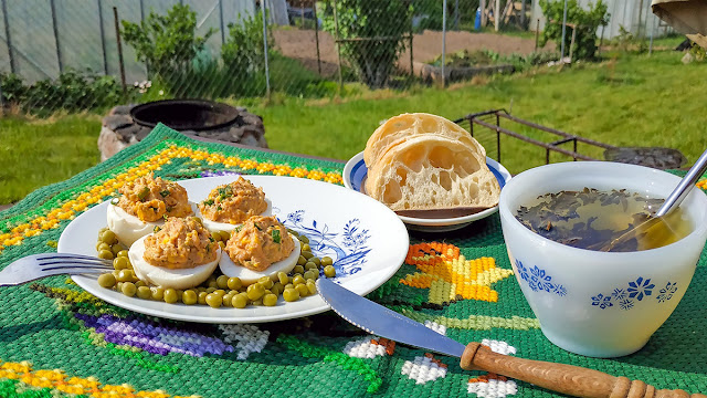 Trečias patiekalas iš prieš tris savaites marinuotų kiaušinių. Stiklainyje buvau užmarinavęs septynis vienetus. Du iš jų suvalgiau be papildomo apdorojimo ir priedų. Norėjau sužinoti, koks skonis ilgiau išbuvusių marinate. Skonis buvo išties puikus. Likusius penkis išrūkinau vyšnios dūmuose. Patys skaniausi buvo šilti, tik ką nuimti nuo ugniakuro. Du pasilikau kitai dienai. Geras skonis buvo ir šaltų.